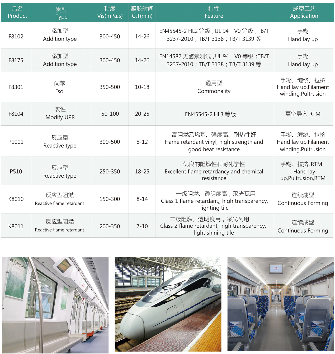 F系列阻燃樹脂具有粘度低、高耐熱等特點(diǎn),制品具有較高的氧指數(shù)和較低的煙密度,廣泛應(yīng)用于軌道交通、建筑裝飾、航空航天等領(lǐng)域。F-series flame retardant resins are low viscosity, high heat resistance unsaturated polyester resins. The
